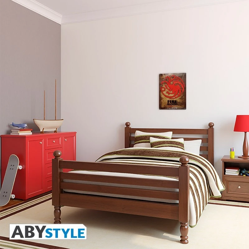 Game of Thrones Plaque Métal Targaryen. Affichez votre appartenance à la maison Targaryen de Game of Thrones. Le célèbre emblème du Dragon et la devise de la maison de Daenerys Targaryen sont ici représentés en relief cela ajoute un superbe effet à cette plaque métal Game of Thrones.