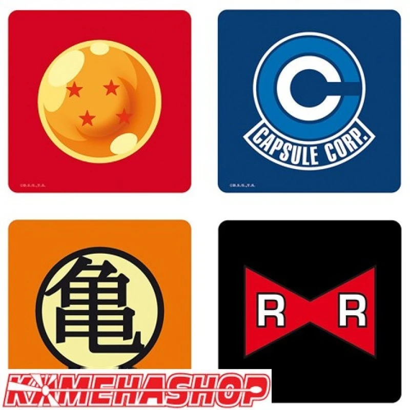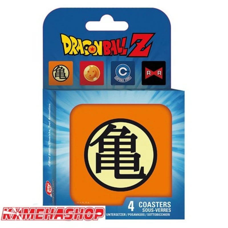 Dragon Ball Z Set de 4 sous-verres DBZ. Set de 4 sous-verres Dragon Ball Z en liège, dimensions 9 x 9 cm. Voici 4 sous-verres Dragon Ball Z idéal pour votre déco avec les logos : Capsule Corp, Kame Symbol, Boule de cristal et Ruban Rouge.